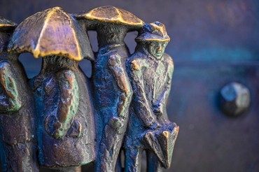 Zu sehen sind zwei Gruppen von Menschen. Eng zusammen gedrängt sind Männer, Frauen und Kinder, die aussehen, als ob sie Schutz suchten. Schutz nicht nur vor dem Regen, sondern auch in der Kirche? - Die rechte Gruppe – so sieht es aus – will in die Kirche hinein, die linke ist im Aufbruch nach draußen begriffen (man spannt den Schirm wieder auf). Es scheint nicht nur zu regnen, sondern auch windig und kalt zu sein, denn das Mädchen (2. Figur von li. beim linken Türgriff) hält den Kragen ihres Mantels hoch und zu. - Vom vielen Anfassen der Türgriffe sind die Schirme ganz blank geworden. Wie schön, wenn „Kunst am Bau“ Geschichte(n) erzählt …