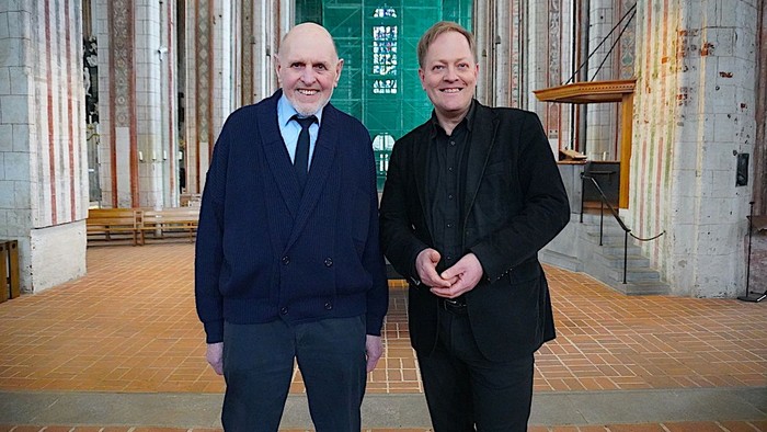 Foto: DSD-Ortskurator für Lübeck, Johannes Schindler, und Marienpastor Robert Pfeifer stehen im Innenraum der St.-Marien-Kirche, der in den kommenden Jahren umfassend saniert wird.