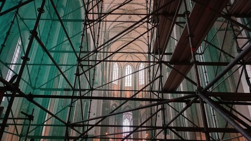 Um an alle Pfeifen und Gehäuseteile des Instrumentes heranzukommen, musste das Gerüst bis unter das Gewölbedach aufgebaut werden. Zahlreich Hilfsmittel wie ein Aufzug, Seilzüge und Winden wurden in das Gerüst eingebaut werden.
