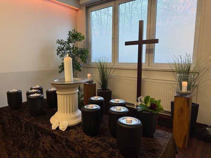 Zwölf schwarze Urnen stehen auf dem Altar der Trauerhalle. Eine große Kerze brennt, ein schlichtes Kreuz ziert das Fenster. Nach und nach betreten Frauen und Männer den Raum, blicken zu den Urnen, verneigen sich, falten die Hände und nehmen leise Platz.