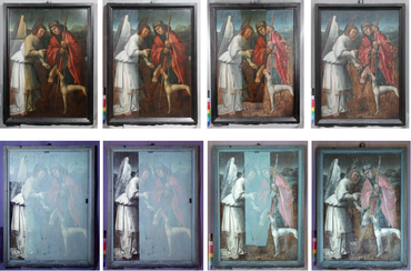 Foto im Text: Hier lässt sich gut erkennen, wie vergilbt die Rochustafel mit den verschiedenen Firnissen bereits war: Die obere Reihe der Abbildungen zeigt Fotografien im Tageslicht, die untere Reihe zeigt jeweils die dazu gehörige Fotografie im UV- Licht.